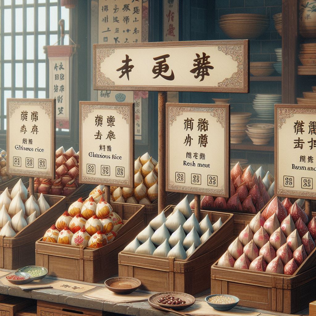 The cooked zòngzi have been arranged on the counter in categories, with a sign in front of each category.