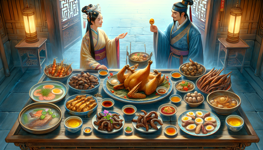 Grilled quail with honey sauce, roasted duck feet with five spices, sea cucumber and pigeon egg soup, barbecued pork, and chicken oil and mushrooms.