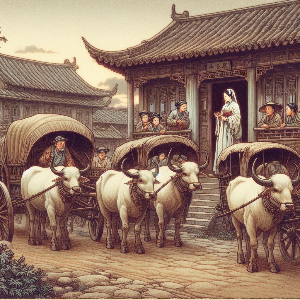Zhou Shuren drove the ox cart. “The ox cart and the cow are part of Xuemei’s dowry. You have made bracelets for your two daughters-in-law. It is not too much to make up for Xuemei’s dowry with the ox cart and the cow.”