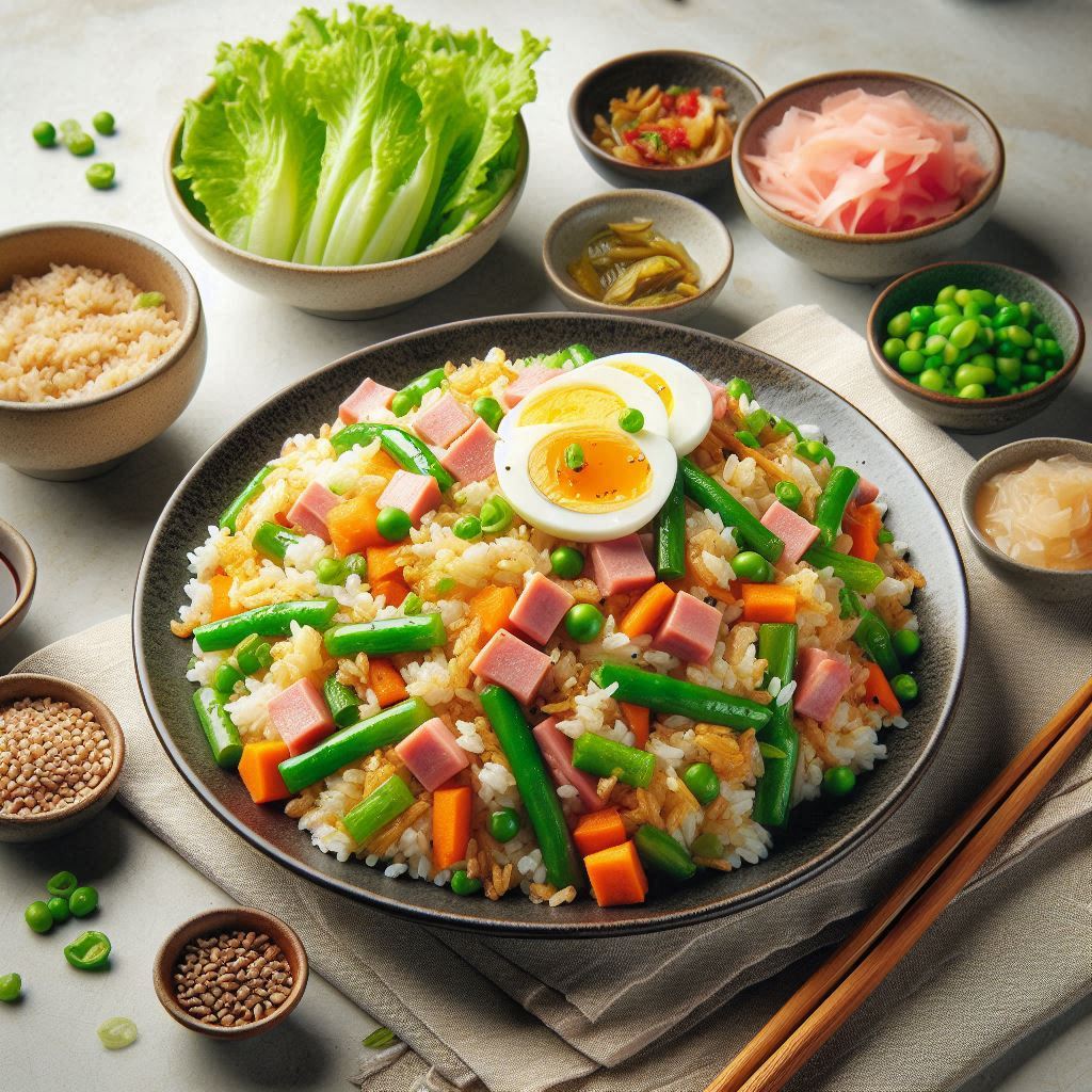 The rice used was the leftover rice from last night, which was now dried and each grain was distinct. It was then stir-fried evenly with diced ham, chopped eggs, green beans, and diced carrots before being served.