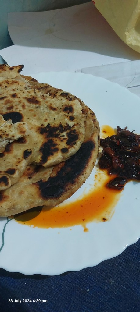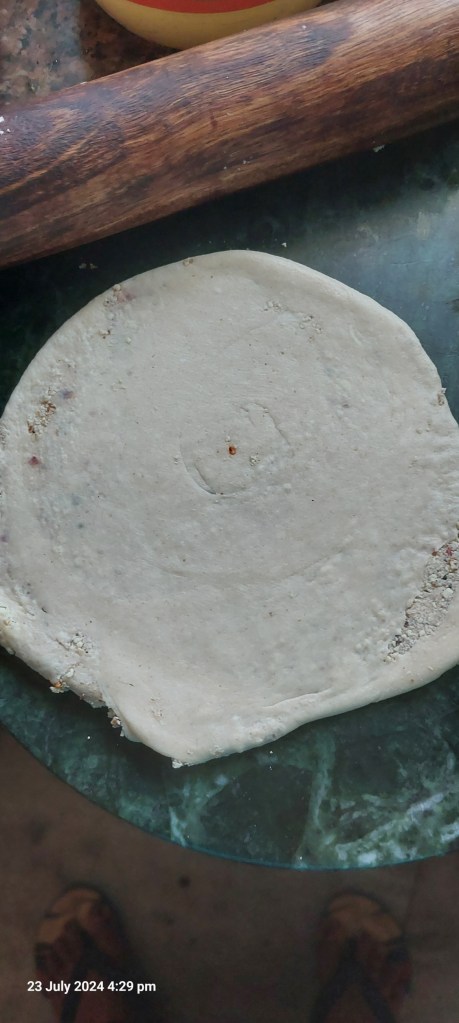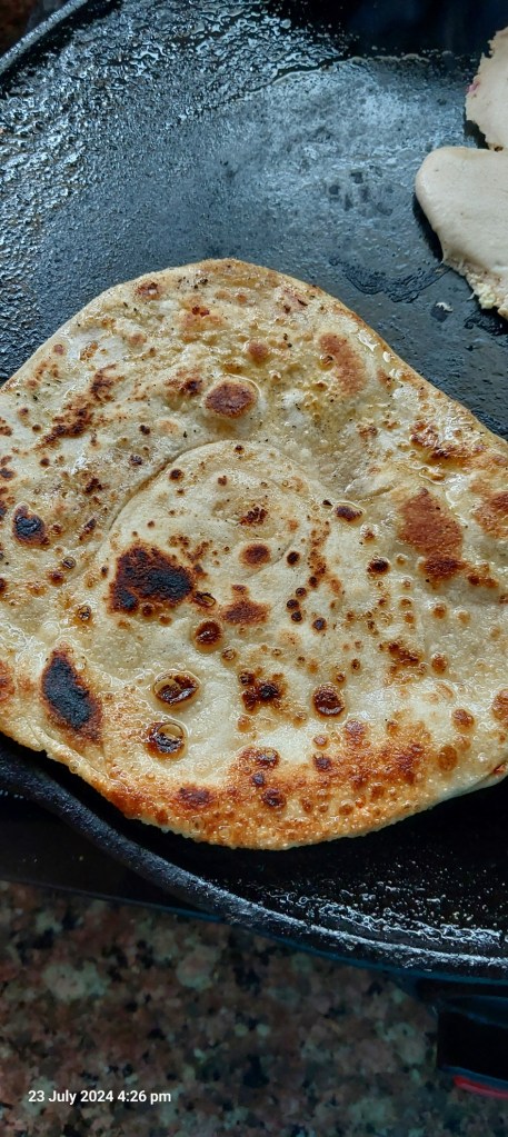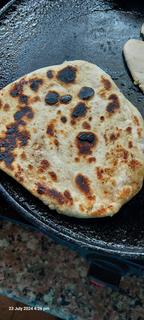 The video of the Goukui in my ADUAAOR, IJWTF, I so wanted to make it. So, today I made a fusion one. For stuffing, I used paneer (cottege cheese) mixed with paratha masala, chilli flakes and rock salt. I also used half all purpose flour (maida) and half whole wheat flour (atta). Instead of lard, I used ghee. The end result was too good. My son now wants it for his tiffin tomorrow.