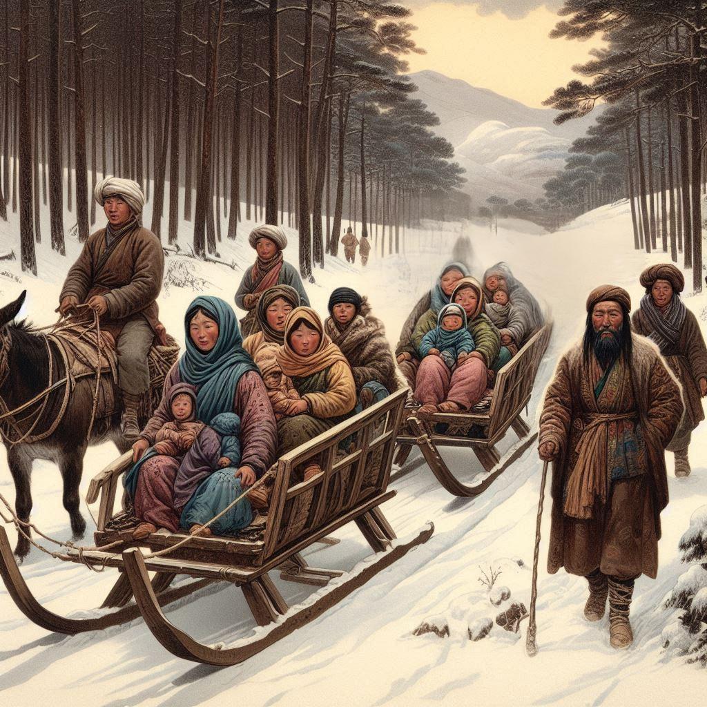 They set off the next morning. The Wang family also bought a donkey yesterday. When the group left, Third Yang sat on the Wang family’s sleigh.