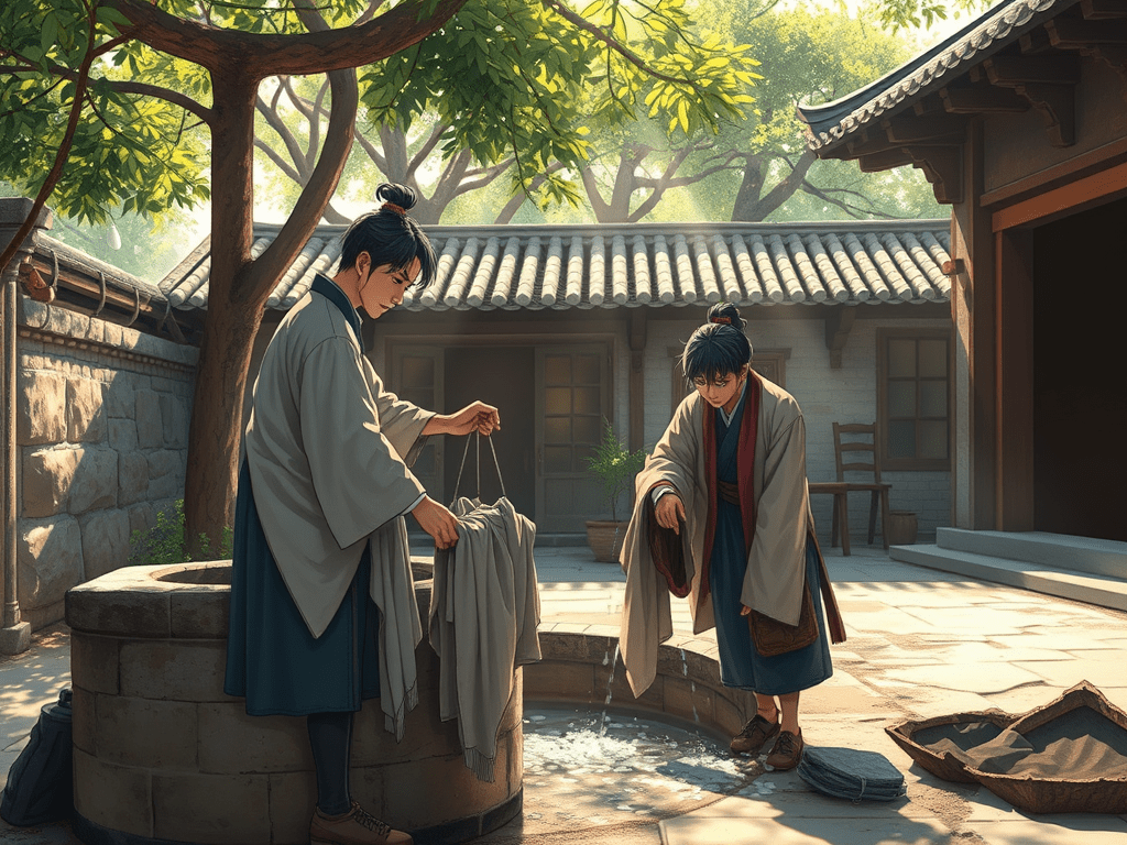 The next day, no villagers came to disturb them. The two families washed in the yard. The women of the Wu family did the work, while the other way around was the case for the Zhou family.