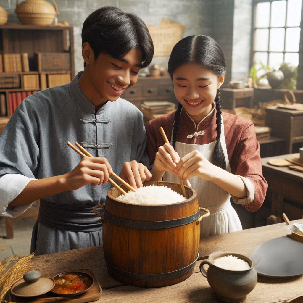 After being busy for the whole evening meal, the two children, who were a little hungry, cheered immediately after hearing the words and turned to scoop rice from the wooden barrel.
