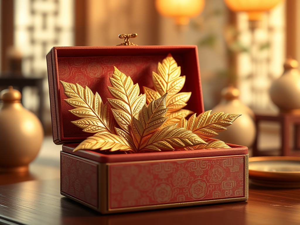 Inside the brocade-lined box, several gold leaves were neatly arranged.